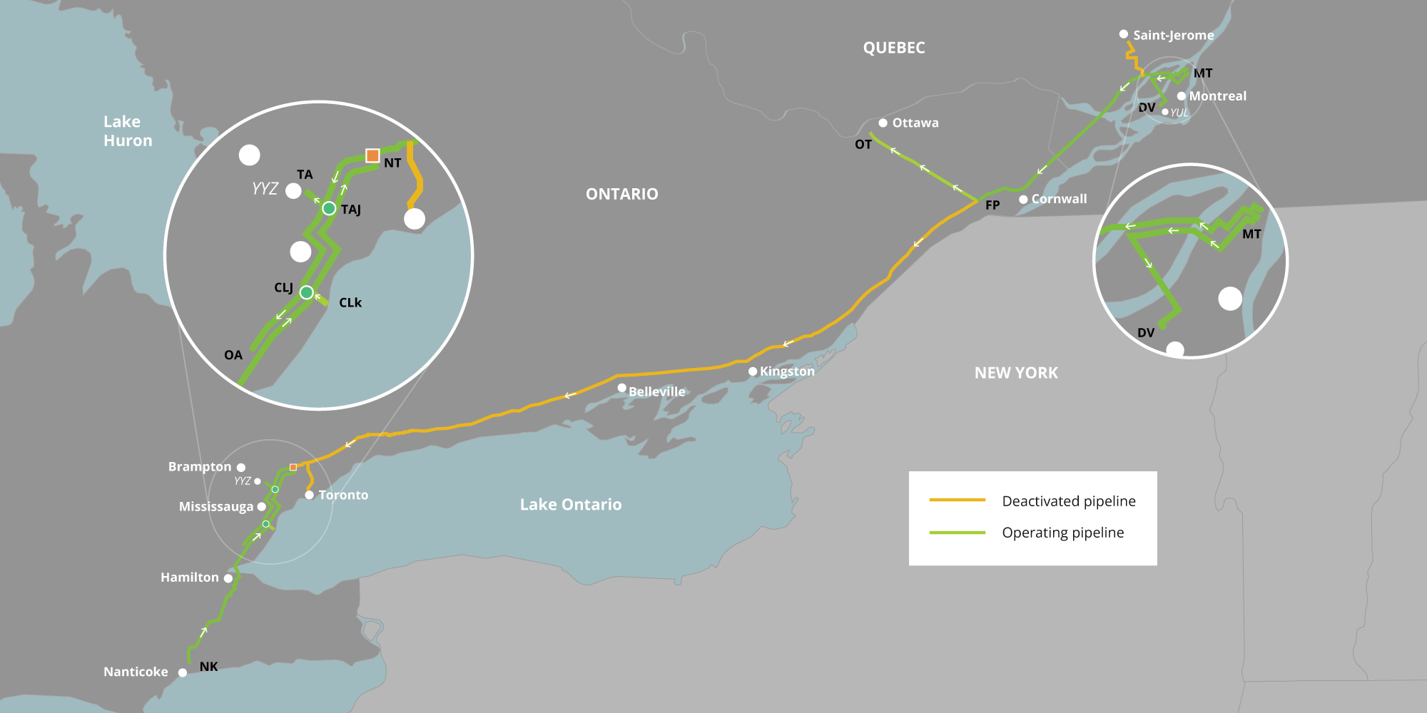 Trans-Northern’s pipeline systems in Ontario, Quebec, and Alberta include both operating pipelines, and deactivated pipelines.